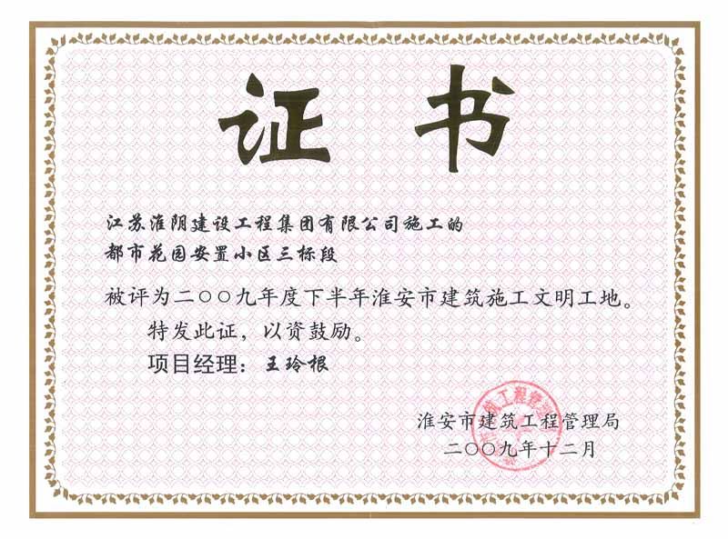 2009年市文明工地都市花园安置小区三标段-王玲根