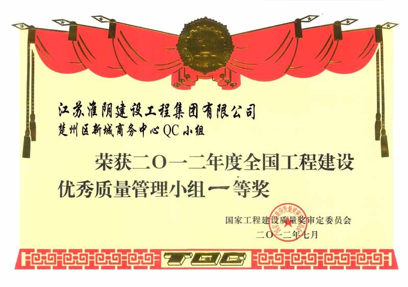 2012年全国工程建设优秀质量管理楚州区新城商务中心小组一等奖